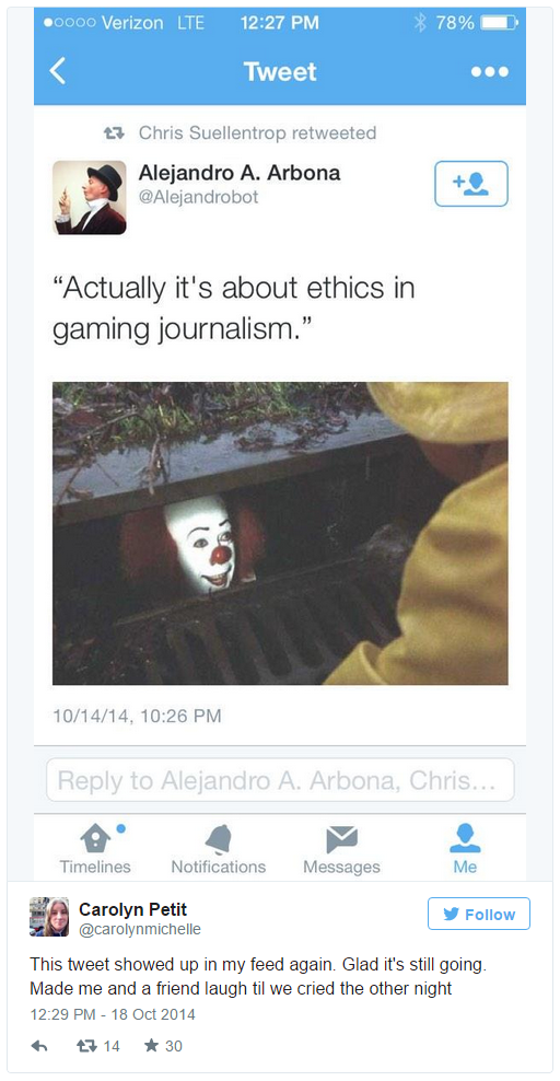 When celebrity Felicia Day wrote about how scary the current environment was, she was immediately targeted and doxxed. When game developer Brianna Wu posted a few memes on Twitter making fun of GamerGate, that was enough to attract terrifyingly specific death threats. It was a consistent pattern of women saying, "I'm scared of GamerGate," followed by a response from GamerGate saying, "Yeah, you should be scared!"